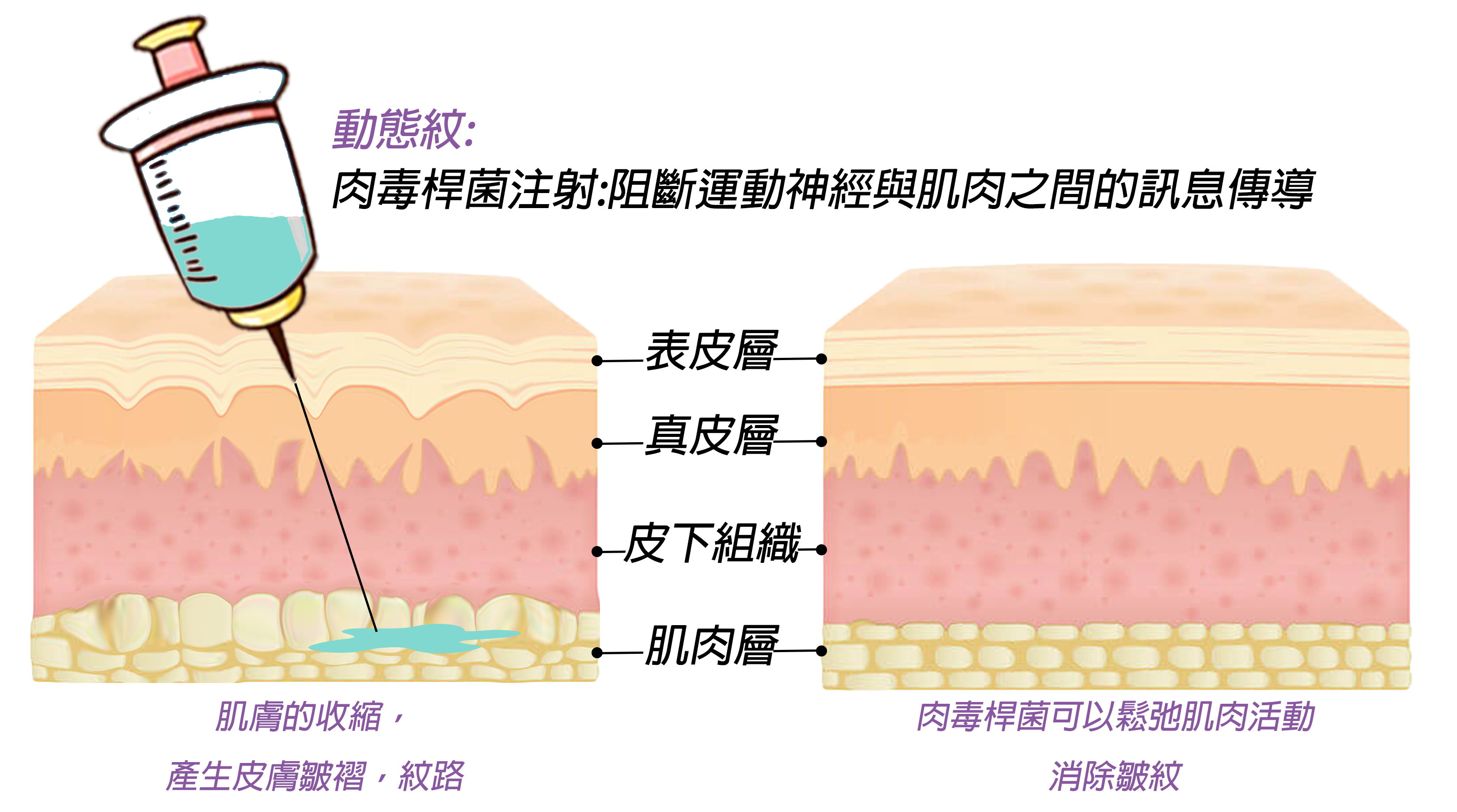 肉毒桿菌素作用在神經末梢,抑制乙醯膽鹼釋放,使肌肉放鬆,撫平皺紋。